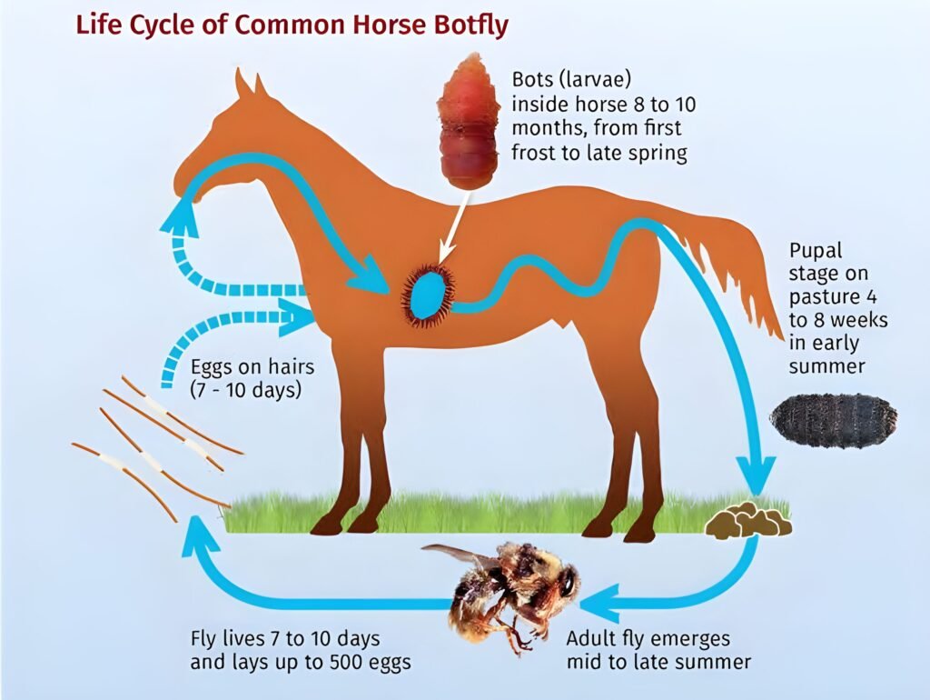 Ingested larvae cannot be treated until they reach the horse’s stomach. Veterinary recommendations suggest targeting them with a single treatment after the first frost of winter, which will eliminate bot flies and prevent further reinfection.