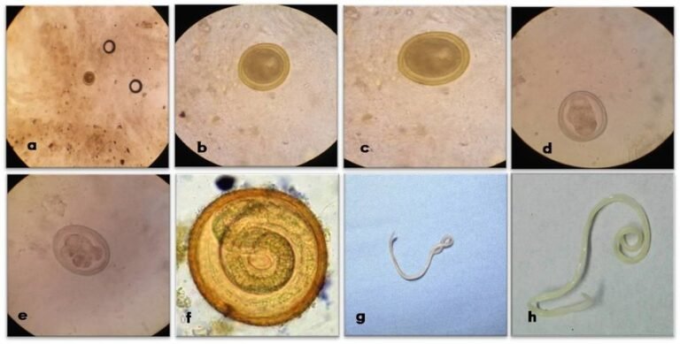 Stages of development of Toxocara canis. a) Toxocara canis (x10) egg with immature one cell stage embryo. b) Toxocara canis (x40) egg with immature one cell stage embryo. c) Toxocara canis egg (x100) with immature one cell stage embryo. d) Toxocara canis egg (x40) after 1 weeks of development. e) Toxocara canis egg (x40) after 2 weeks of development. f) Toxocara canis (x100) mature egg containg 2 nd stage larvae after 3 weeks. g) Toxocara canis male (canine roundworm) from a puppy 4-10 cm long, the posterior end of the male is curved ventrally. h) Toxocara canis female (canine roundworm) from a puppy 5-18 cm long