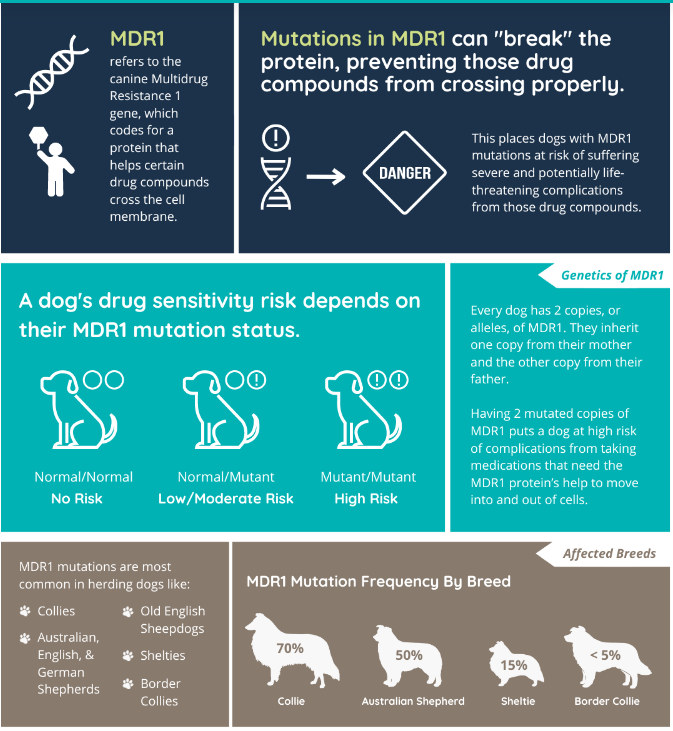 The most common breed associated with MDR1 mutation is the Collie, but generally, herding breeds are affected, and that includes any mixed breeds you might find at the shelter. Below is a list of breeds that are frequently affected by the MDR1 mutation.